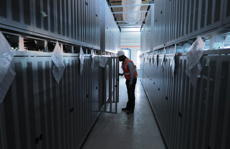 Archival photo of Moss Landing, and the inverters outside the building housing the lithium-ion battery banks.