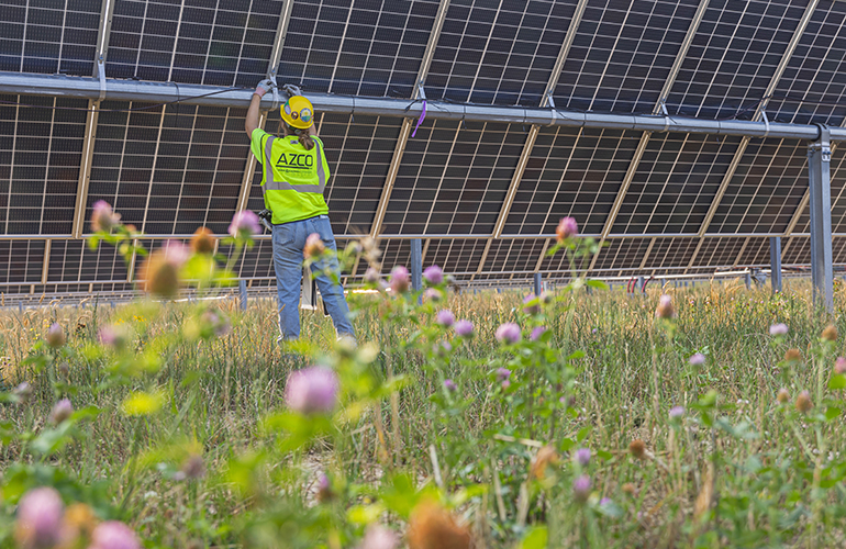 A solar technician inspects wiring on a single-axis solar tracker project. Burns & McDonnell